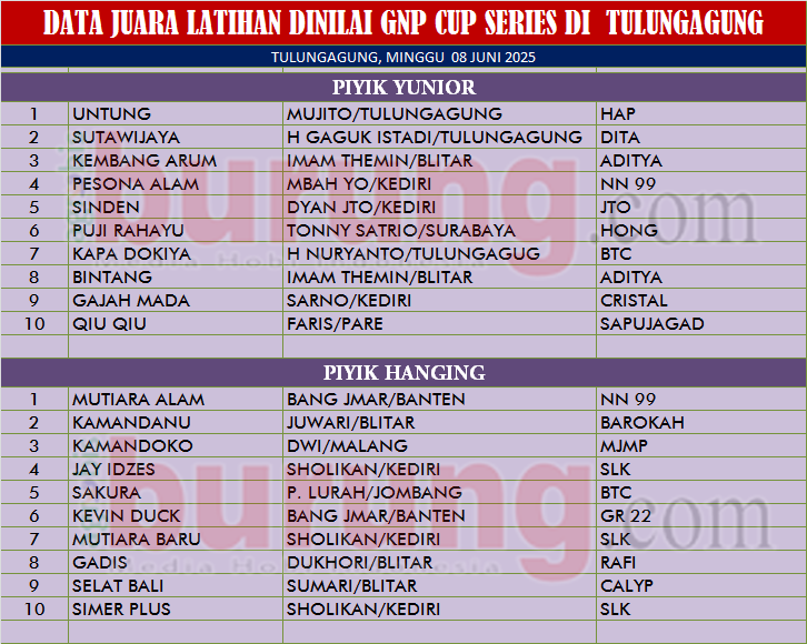 Gelaran Latihan Dinilai GNP Seri di Tulungagung pada Minggu (08/06) di lapangan Dewandaru berjalan meriah dan full gantangan, apalagi jelas sepekan LPI di Jember mmbuat banyak kungmania yang merapat untuk test case persiapan jawara handalnya di even nasional tersebut. Galih GNP, pembina Team GNP yang juga leader di latihan tersebut mengatakan bahwa eksistensi latihan seperti GNP Seri ini snagat bagus untuk mengajak para pemula baru terjun di hobi perkutut, apalagi gelaran latihan dinilai GNP Series ini selalu diserbu kungmania Tulungagung dan sekitarnya serta dari berbagai kota seperti Ponorogo, Blitar, Malang, Jombang, Kediri.