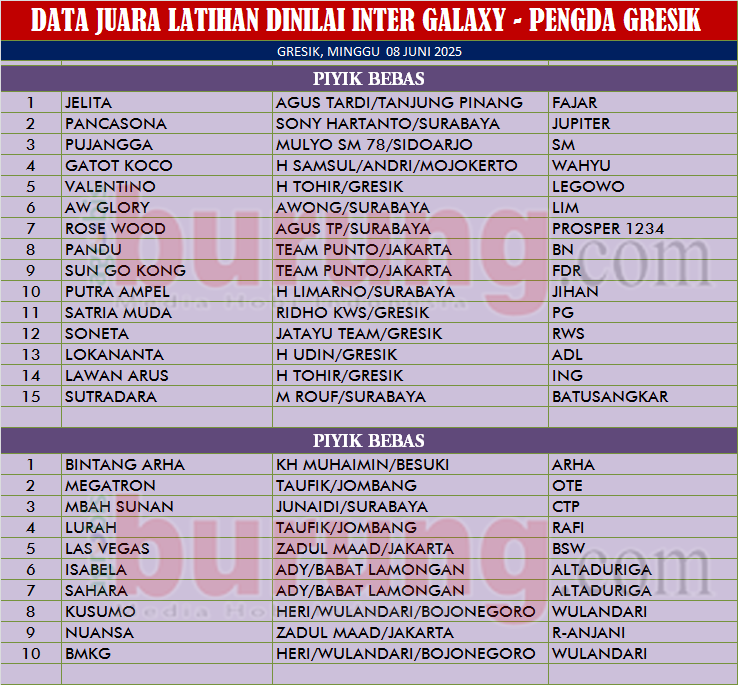 Gelaran latihan dinilai Inter Galaxy Gresik pada Minggu (08/06) benar benar seru dan menarik, pasalnya beberapa burung “petarung” Nasional sedang test settingan jelang LPI di Jember pekan depan. H Hannan RWS mengatakan bahwa kegiatan latihan dinilai Inter Galaxy di Gresik memang semakin meningkat dan semakin diminati, semarak hobi perkutut di Gresik dan sekitarnya memang mempunyai pengaruh besar peningkatan minat kungmania berlomba. Padahal sekarang jadwal lomba sangat padat namun di Gresik hobi perkutut bpadat berlomba benar benar naik grafiknya.