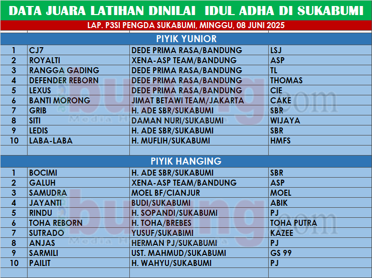 SUKABUMI, agrobisburung.com – Memanfaatkan momentum Hari Raya Idul Adha 1446 H dan liburan panjang, kungmania Jawa Barat bersilaturahmi di lapangan P3SI Pengda Sukabumi, Minggu (8/6/25), mengikuti gelaran Latihan Dinilai (Ladini) khusus piyikan. Kegiatan ini mengisi kekosongan jadwal di wilayah Jabar, sekaligus persiapan sebelum mengikuti lomba nasional LPI #4 Jember (14-15/6/25) dan LPJB #5 Bupati Cup Ciamis (29/6/25). “Alhamdulillah peserta hadir dari perwakilan Jabar, seperti Sukabumi, Cianjur, Bandung dan Cirebon. Selain itu juga hadir pula perwakilan dari Jabodetabek. Ladini ini memanfaatkan momentum Idul Adha, sekaligus menjaga eksistensi perkutut Sukabumi,” ujar H. Herman PJ ketua P3SI Pengda Sukabumi.