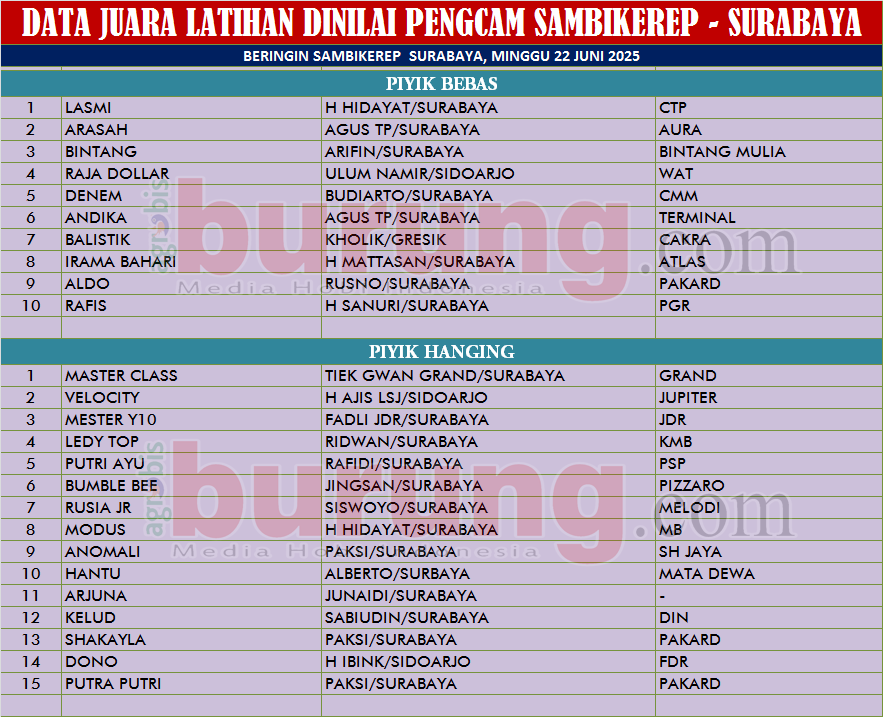 SURABAYA, agrobisburung.com – Gelaran latihan dinilai Pengcam Sabikerep Surabaya pada Minggu (22/06) di lapangan perkutut Beringin Sambikerep Surabaya berjalan meriah dan sukses, kungmania Surabaya, Sidoarjo, Gresik dan sekitranya meramaikan gelaran tersebut. Sabiudin, ketua Pengcam Sabikerep mengatakan bahwa agenda Latihan Dinilai Pengcam Sambikerep semakin besar peminatnya apalagi setelah penambahan 1 blok kerekan membuat kelas yang dibuka setiap latihan dinilai ada dua kelas. “Alhamdulillah pesertanya selalu full, kami sangat berterima kasih kepada kawan kawan yang sudah support keberadaan Lap. Beringin yang memberikan ruang dan wadah untuk menyalurkan hobi dan selamat kepada para juara di latihan dinilai kali ini,” ucap Sabiudin yang diaminin panitia lainya.