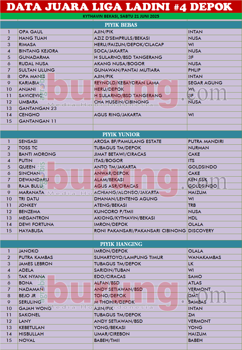 elaran putaran ke-4 seri Liga Ladini Depok Bersatu 2025 yang dilaksanakan pada Sabtu (21/06) di lapangan perkutut Kythavin Bekasi berjalan meriah dan menarik sert dihadiri kungmania di seputaran DKI dan sekitarnya. Heru WI, koordinator Liga Ladini “Depok Bersatu 2025” mengatakan bahwa seri lanjutan Liga akan terus dilaksanakan sesuai jadwal yang sudah disusun dan kebetulan seri ke-4 di laksanakan di lap. Kythavin Bekasi. Pesertanya juga tetap antusias untuk meramaikan Liga tersebut. Menariknya minat peserta selalu bertambah ketika agendanya di update dan selalu full pesertanya.