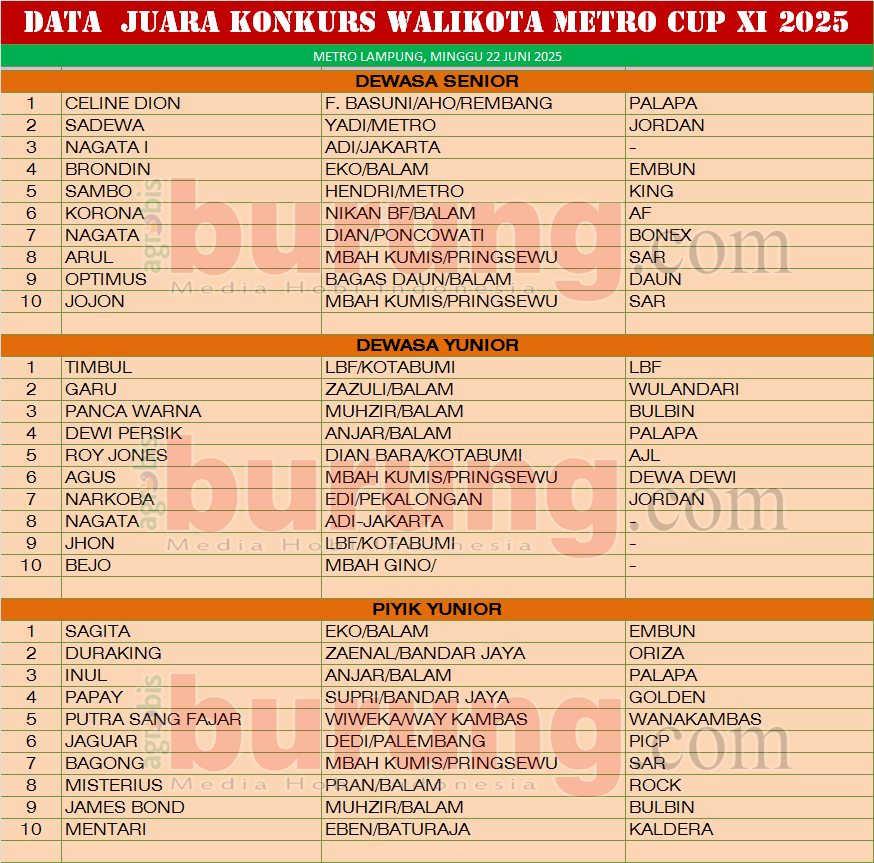 METRO-LAMPUNG, agrobisburung.com – Gelaran Walikota Cup Metro Cup XI pada Minggu (22/06) berlangsung meriah dan lancar di lapangan Pengda Metro 16C Metro- Lampung. Walau Walikota berhalangan hadir kegiatan konkurs tersebut tetap berjalan meriah dan Darmo Halim. ketua pengda Metro mengatakan bahwa kegiatan ini sudah berjalan selama beberapa tahun dan kebetulan juga agenda Walikota juga sangat padat dan di wakilkan kepada Pengda dan panitia pelaksana. “Kegiatannya berjalan lancar dan seru, ada beberapa kungmania dari luar Metro-Lampung yang bergabung seperti dari Palembang, Baturaja, Jakarta dang Kungmaia Metro -Lampung dan sekitarnya. Pertarungan jawara yang dilombakan juga menarik karena dengan aturan penilaian yang terbaru kita semua bisa melihat kualitas burung dengan benar dan juga kita juga melakukan cek ring usai lomba,” ucap Darmo Halim pada agrobisburung.com