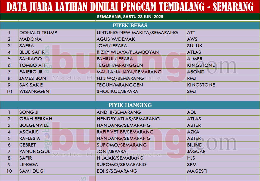 Sementara itu jalannya latihan dinilai benar benar seru, turunnya beberapa jawara baru mewarnai pertarungan di kelas yang dimainkan, di piyik bebas, jawara Donald Trump bergelang ATT milik Untung New Makita Semarang melejit ke podium pertama. Kemenangan ini memang diprediksi sejak awal karena tampilan Donald Trump sangat energik untuk merebut posisinya dan disusul jawara Madona bergelang AWS dan Saera begelang Suluk yang menempati podium kedua dan ketiga.