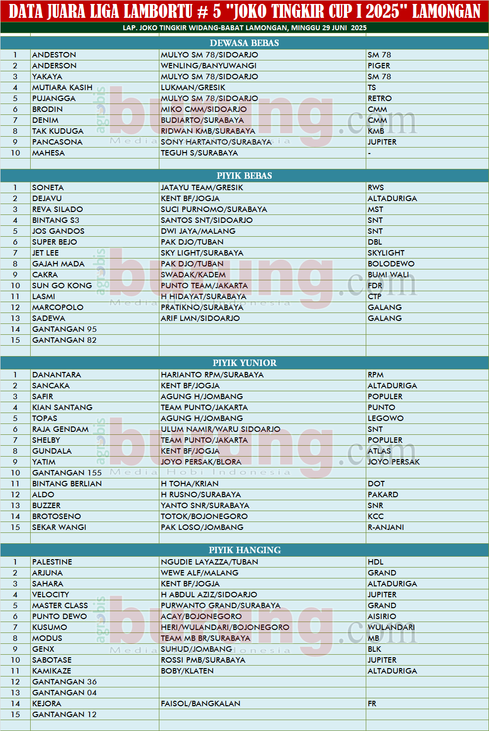 Gelaran Liga Lambortu 2025 # 5 yang dilaksakan Pengda Lamongan pada Minggu (29/06) di Lapangan Joko Tingkir Widang-Babat Lamongan benar benar memberikan warna baru dalam perkembangan perkutut di Lambortu (Lamongan -Bojonegoro dan Tuban). Apalagi disaat bersamaan gelaran juga ada sesi pelantikan ketua Pengda Lamongan, Ady Altaduriga oleh PJ. Ketua Pengwil Jatim sehingga gelarannya dalam segi pelaksanaan lomba dan juga kelas yang dimainkan benar benar sangan menarik. Bahkan baru di gelaran “Joko Tingkir Cup 1 Pengda Lamongan benar benar meriah karena ada 4 kelas yang dimainkan sehingga banyak kungmania dai Surabaya, Jombang, Mojokerto dan juga Blora merapat ke gelaran yang di laksanakan Pengda Lamongan.