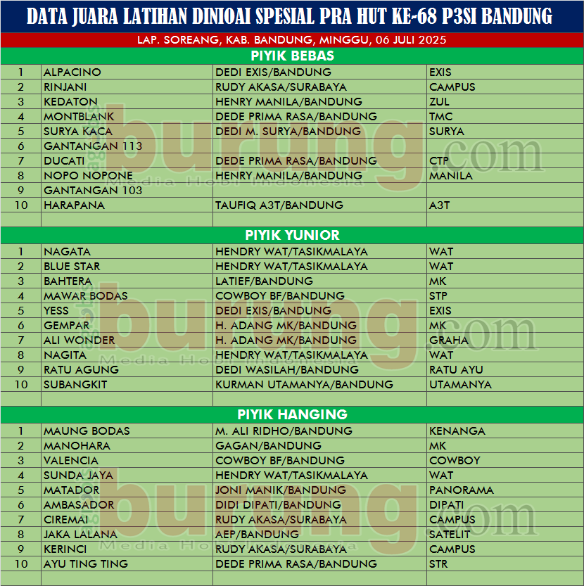 WAT BF Tasikmalya kembali membuktikan kualitas produknya. Di Ladini Spesial Pra HUT ke-68 P3SI, di lapangan Soreang, Kab. Bandung, Minggu (6/7/25), empat produk terkini WAT BF berhasil naik podium. Bahkan, dua diantaranya menguasai 2 besar di kelas piyik yunior dan jawara jawara lainnya juga tampil terbaik di kelasnya masing masing.