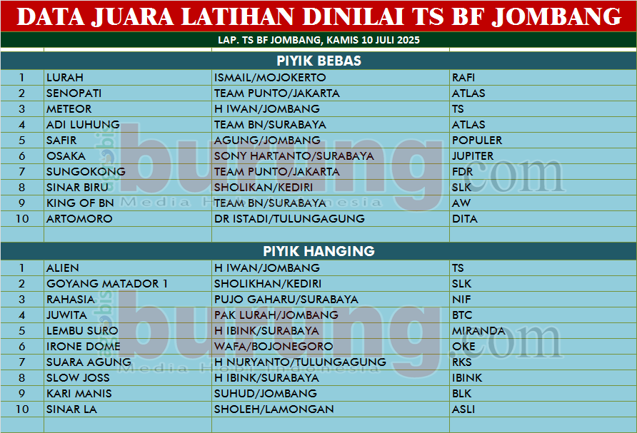 JOMBANG, agrobisburung.com –  Gelaran perdana latihan dinilai TS BF di Jombang pada Kamis (10/07) menjadi agenda penting kegiatan latihan dinilai selanjutnya di markas TS BF tersebut. H Iwan, pemilik TS BF mengatakan bahwa kegiatan ini terlaksana karena banyak kungmania yang sering latihan di TS mengusulkan supaya digelar latihan. Dan karena siap mendukung, gelaran perdana latihan tersebut langsung dilaksanakan dan ke depannya akan dijadikan Liga TS BF namun masih dikoordinasikan dengan pengda Jombang untuk jadwalnya. “Terima kasih kepada kawan kawan yang hadir di latihan dinilai TS BF Jombang dan selamat kepada para pemenang lombanya,” ucap H Iwan pada agrobisburung.com