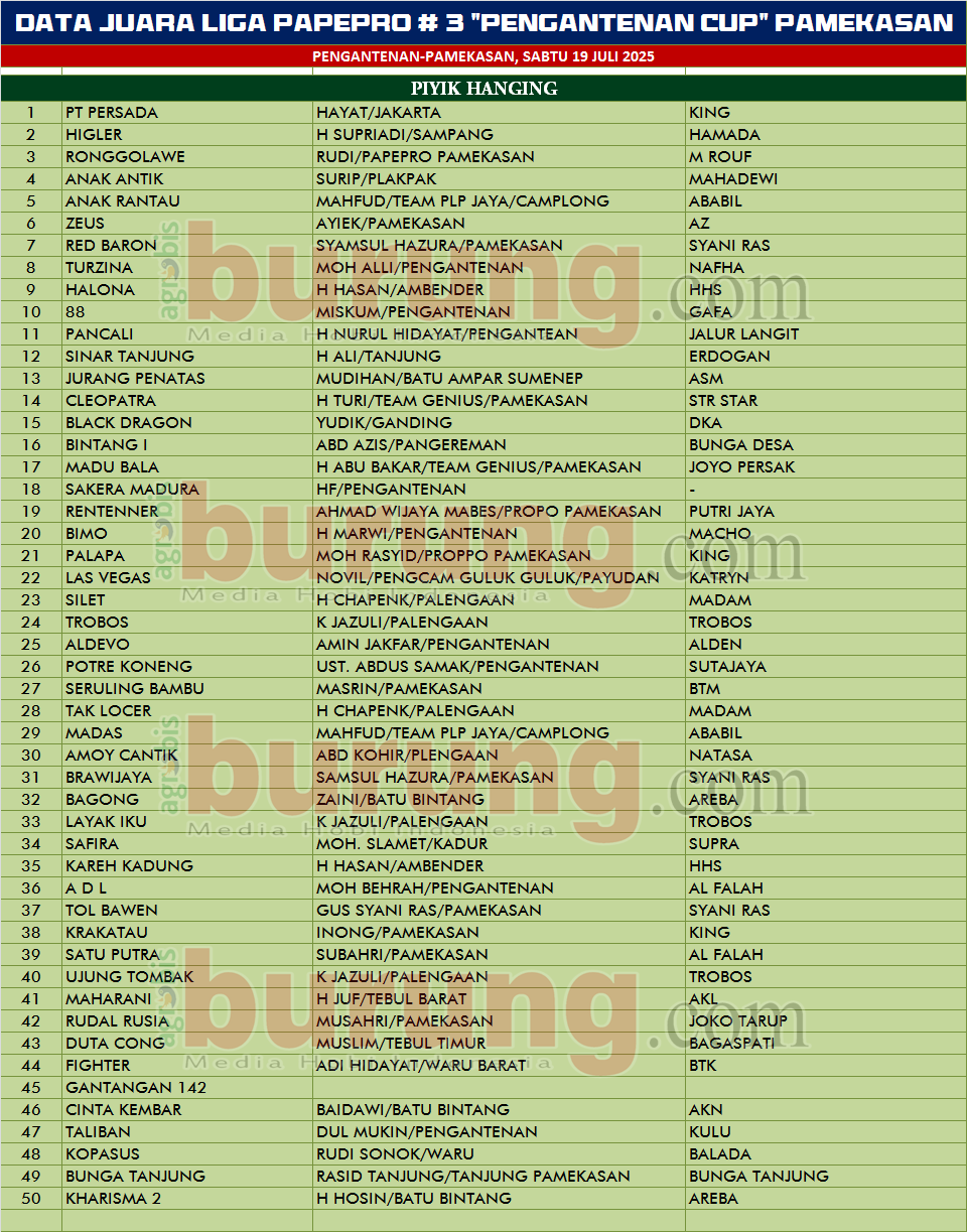Gelaran Liga Hanging Papepro # 3 Pengantenan Cup 2025 pada Sabtu (19/07) di lapangan Sepak Bola Pengantenan Pamekasan berlangsung seru dan meriah. Iwan Kulu, ketua pelaksana Liga mengatakan gelaran ini menjadi agenda penting untuk memajukan dan menyemarakkan hobi perkutut di daerah Papepro Pengantenan dan secara umum untuk kemajuan perkutut di Pamekasan.
