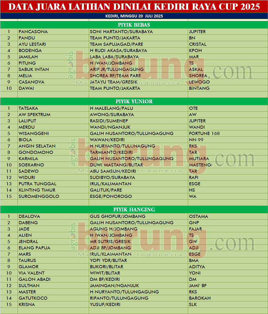 Di kelas piyik yunior, debutan muda Tatsaka bergelang OTE milik H Malelang Palu yang dikawal Rizky – Amir bersama tuan barunya langsung semakin joss saja peformanya dan kembali merajut kemenangan di posisi pertama di Kediri. Dan jawara AW Spektrum bergelang AW dan Laliput bergelang Jupiter menyusul ke posisi kedua dan ketiga di kelasnya.