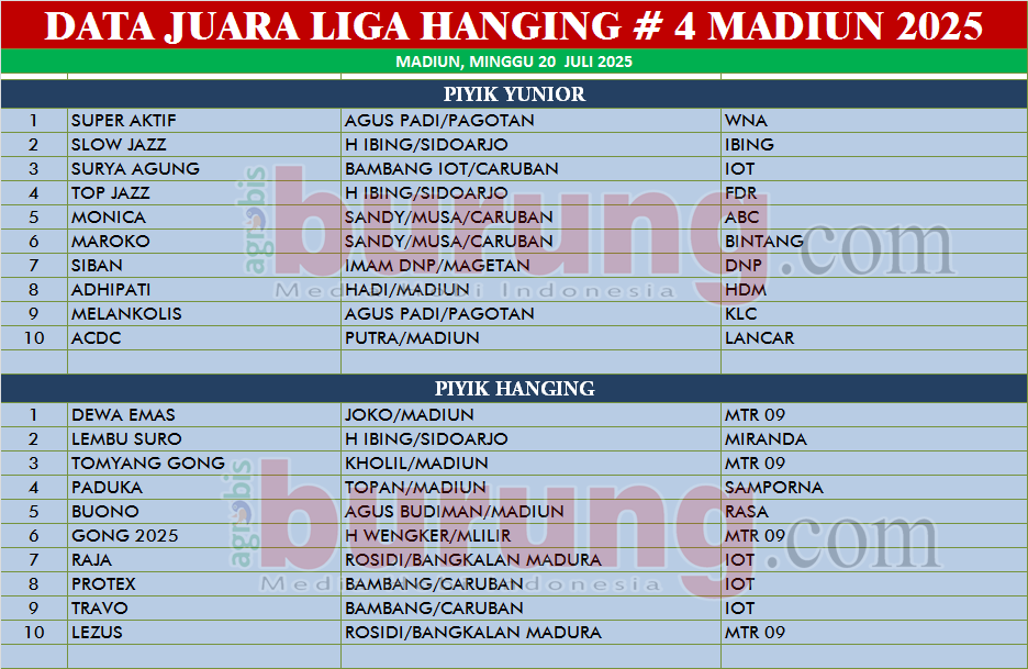 MADIUN, agrobisburung.com – Lanjutan seri Liga Hanging Madiun  #4 pada Minggu (20/07) di lapangan Pengda Madiun berlangsung ceria, beberapa tetamu dari luar Madiun terlihat juga ikutan dalam gelaran kali ini. Musa Bintang, ketua Liga Hanging Madiun mengatakan bahwa pelaksanaan Liga Hanging dari seri 1 sampai ke-4 memang ada grafik peningkatan pesertanya bahwa ada beberapa kungmania dari Madiun ikutan meramaikannya. Namun kungmania pemula khususnya dari Madiun juga semakin banyak, tentu ini sejalan dengan program tahun 2026 Pengda Madiun sudah mengajukan agenda LPI untuk bisa dilaksanakan di Madiun. “Mari kita ramaikan lagi hobi perkutut di Madiun karena sudah ada kepastian bahwa salah satu agenda LPI 2026 akan dilaksanakan oleh Madiun sebagi wakil wilayah Jatim Selatan yang selama ini belum pernah menggelar gelaran nasional,” ucap Musa Bintang yang dibenarkan Bambang IOT, ketua pengda Madiun.