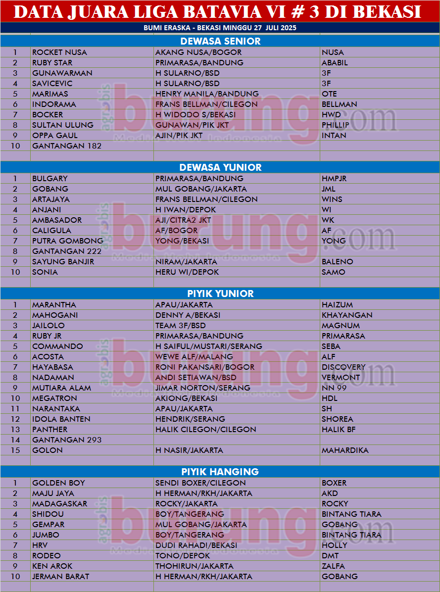 BEKASI, agrobisburung.com – Gelaran Liga Batavia VI # 3 yang dilaksanakan pada Minggu (27/07) di lapangan Eraska Bekasi menjadi “saksi bisu” gelaran tertinggi hobi perkutut Sejabodetabek di tahun 2025 ini dan gelarannya juga semakin banyak diminati kungmania dengan ikut meramaikannya. Rudi AF, panitia mengatakan bahwa gelaran Liga Batavia 2025 dari sejak di gulirkan memang luar biasa antusias pesertanya dan di gelaran di Lap. Eraska Bekasi pesertanya juga full. Bahkan kugmania Sejabodetabek, Banten dan juga peserta/kungmania dari Jawa Barat selalu ikutan berpartisipasi dalam seri Liga Batavia. “Terima kasih kepada semua kungmania yang sudah mendukung penuh agenda Liga Batavia 2025 dan terima kasih kepada kru panitia yang sudah bekerja dengan sukses mempersiapkan dan melaksanakan liga tersebut. Dan selamat kepada para pemenang Liga atas prestasi jawaranya masing masing,” ucap Rudi AF.