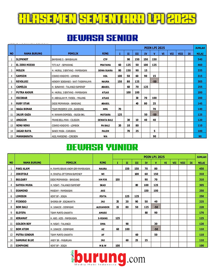 Konkurs LPI #6 Cakraadiningrat 2025 menjadi agenda laga mandatory fight untuk semua penghuni klasemen sementara LPI 2025, setidaknya di gelaran LPI Bangkalan para jawra lPI akan berusaha tampil optimal untuk mengamankan poin dan posisi terbaiknya. Di dewasa senior, jawara SlipKnot bergelang CTP milik Bambang Bangkalan akan tampil all out pasalnya dan tiga kali tampilannya di seri LPI terkahir belum pernah dilahkan dan secar seri menguasai podium pertama. El Zero Miedo bergelang Pratama milik Titi ALF dan juga Molen bergelang Dewa Suara tentu juga dipersiapkan optimal untuk merebut yang terbaik dan pasti beberapa jawara handal lainnya juga sedang on fire bakal siap bikin kejutan di LPI Cakraadinigrat Cup 2025.