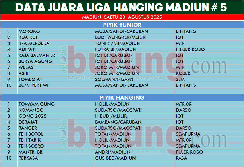 Di kelas piyik hanging, debutan belia bernama Tomyang Gung bergelang MTR 09 milik Holil Madiun mendominasi jalannya Liga di kelasnya dan dibabak penentuan langsung mengunci kemenangannya di podium pertama. Sementara jawara Komando bergelang Darso dan Gong 2025 bergelang IOT yang sempat memberikan perlawanan harus puas berada di podium kedua dan ketiga.