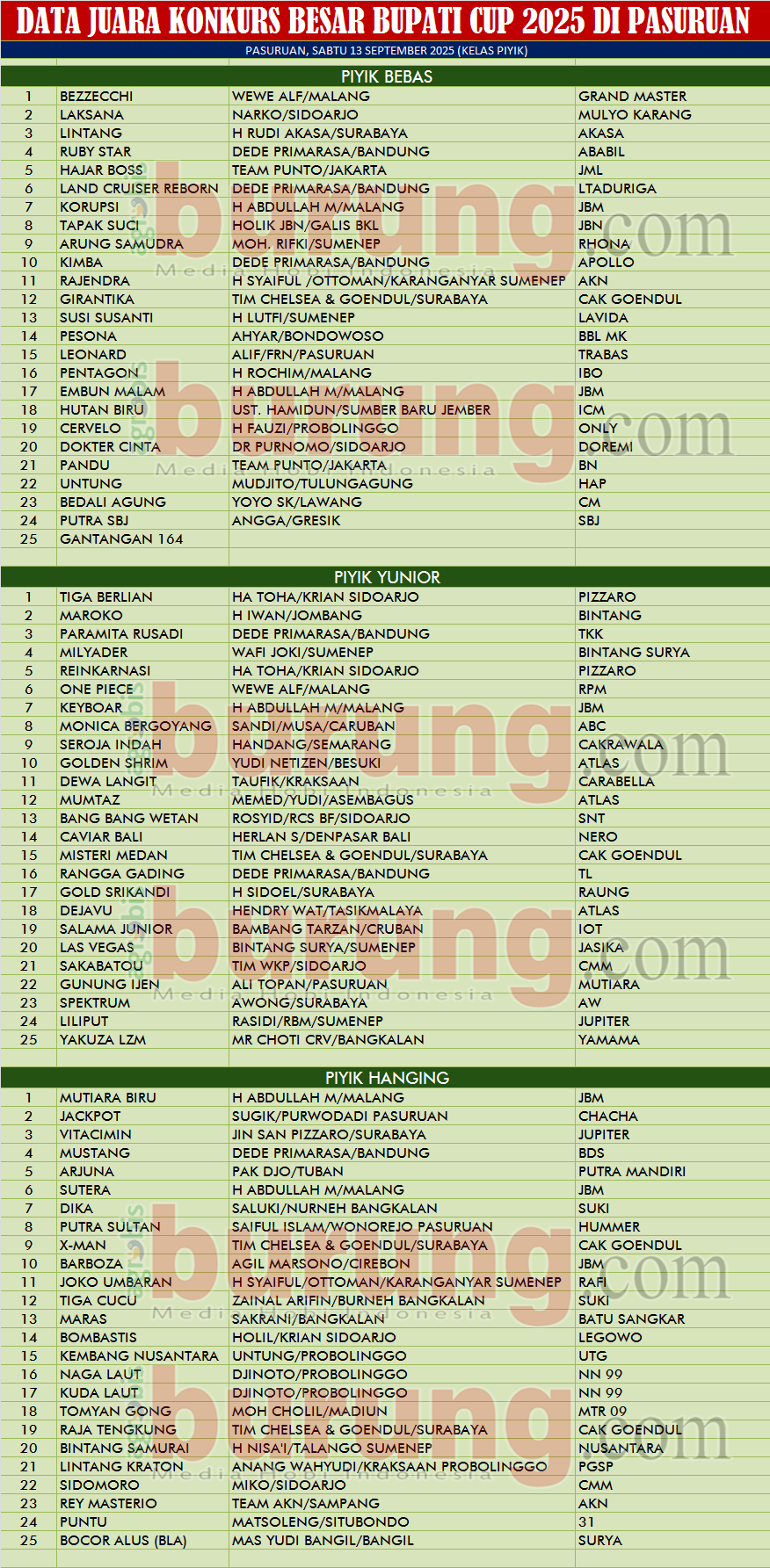 Data Juara, Sabtu (Kelas Piyik) Di Konkurs Bupati Cup 2025 Pasuruan & Breaking News Dinas Pariwisata Kab. Pasuruan Berikan “Edukasi Budidaya Perkutut Untuk Siswa”