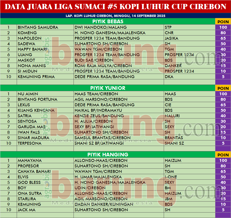 Bintang Samudra orbitan anyar STP BF Bandung milik Dwi Handoko Malang yang dikawal Erwin Zeus, berhasil menguasai ketatnya persaingan di kelas piyik bebas Liga Sumaci #5 Kopi Luhur Cup, di Lapangan Kopi Luhur Cirebon, Minggu (14/9/25). Mengawali debutnya di kelas kerekan full, burung muda ini berhasil menampilkan performa terbaiknya. Memimpin sejak babak awal dan tuntas hingga babak akhir dengan kemenangan meyakinkan.
