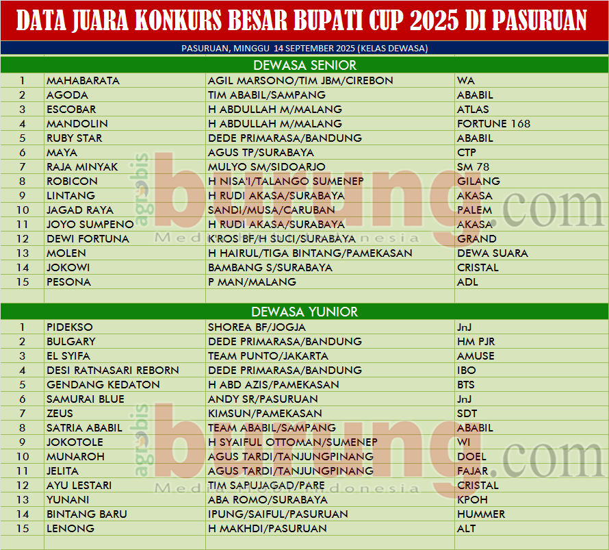 Gelaran hari kedua konkurs besar Bupati Cup 2025 Pasuruan pada Minggu (14/09) yang memainkan kelas dewasa (senior dan yunior) tetap berlangsung meriah. Walaupun sempat dikuatirkan hembusan angin akan lebih kencang sejak dimulainya babak pertama namun hingga akhir gelaran semuanya lancar dan sukses. Hari Aprianto, ketua pengda Kab. Pasuruan mengatakan bahwa agenda dan gelaran Bupati Cup 2025 di Pasuruan menjadi salah satu eksistensi pengda untuk tetap eksis dan membangun hobi perkutut secara berkesinambungan, khususnya di Kab. Pasuruan.