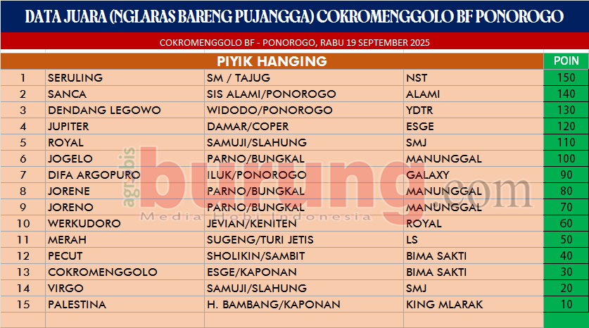 Gelaran “Nglabar” Nglaras Bareng Pujangga #3 pada Rabu (17/09) di markas Cokromenggolo Bf Badengan Ponorogo menjadi ajang khusus kungmania atau peternak di kota Ponorogo untuk pamer produk terbaiknya. Agus ESGE, salah satu panitia Liga Hanging khusus ring Ponorogo mengatakan bahwa rutinitas Nglaras Bareng ini sudah bergulir gelaran dan alhamdulillah peningkatan kungmania/peternak khususnya di Ponorogo semakin meningkat grafik pesertanya. Panitia benar benar mengkhususnya hanya hasil breeding peternak Ponorogo saja yang bisa mengikuti gelaran Nglaras Bareng ini dan ini juga menjadi penyemangat untuk peternak di Ponorogo untuk bisa membuktikan hasil kualitas terbaiknya untuk di lombakan.