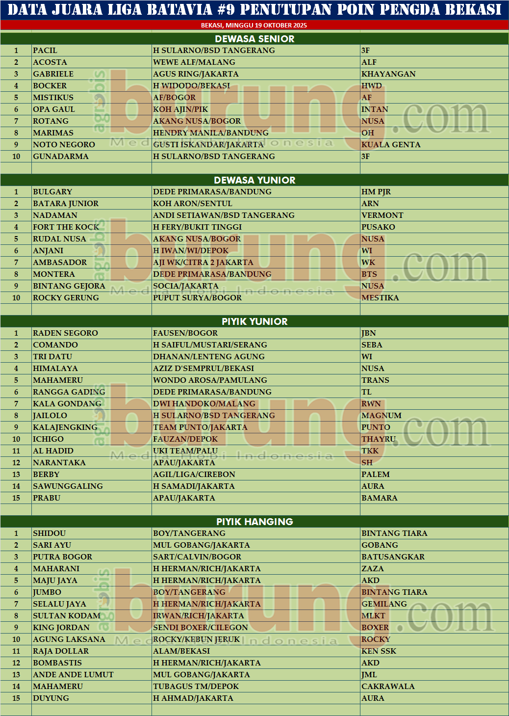 BEKASI, agrobisburung.com – Seri lanjutan Liga Batavia 2025 akhirnya sampai sampai pada seri “akhir” pengumpulan poin Klasemen burung terbaiknya dan gelaran ke-9 dilaksanakan pada Minggu (19/10) di Lap. Irama Budidaya Bekasi. H Wahyudi, ketua pengda Bekasi mengatakan bahwa gelaran Liga Batavia #9 ini menjadi akhir perburuan poin sekaligu smengunci poin terakhir untuk burung burung terbaik di Klasemen Liga Batavia 2025 dan Alhamdulillah pelaksanaan lancar dan meriah plus pesertanya juga sangat antusias. “Kami atas nama pengda Bekasi dan panitia mengucapkan terima kasih kepada semua pendukung kesuksesan gelaran ini, terima kasih juga kepada ketua pengwil Sejabodetabek atas dukungannya. Dan selamat kepada para juara yang sudah secara rutin mengikuti seri demi seri di Liga Batavia 2025,” ucap H Wahyudi pada agrobisburung.com