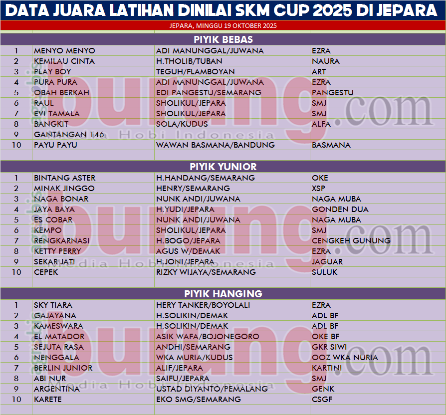 Agenda rutin yang sudah diangedakan Pengda Jepara dalam latihan dinilai SKM Cup 2025 pada Minggu (19/10) di Lap. SKM Bonjot Pecangan Jepara berlangsung sukses, meriah dan seru. Iskan Wibowo, ketua pengcam Kalinyamatan Jepara mengatakan bahwa salah satu semaraknnya hobi perkutut di Jepara adalah pelaksaaan rutin latihan dinilai SKM yang memang menjadi “barometer” hobi perkutut di Jepara. Dan pelaksanaannya selalu mendapat dukungan dari kungmania Jepara dan sekitarnya yang juga langsung hadir mengikuti lomba.