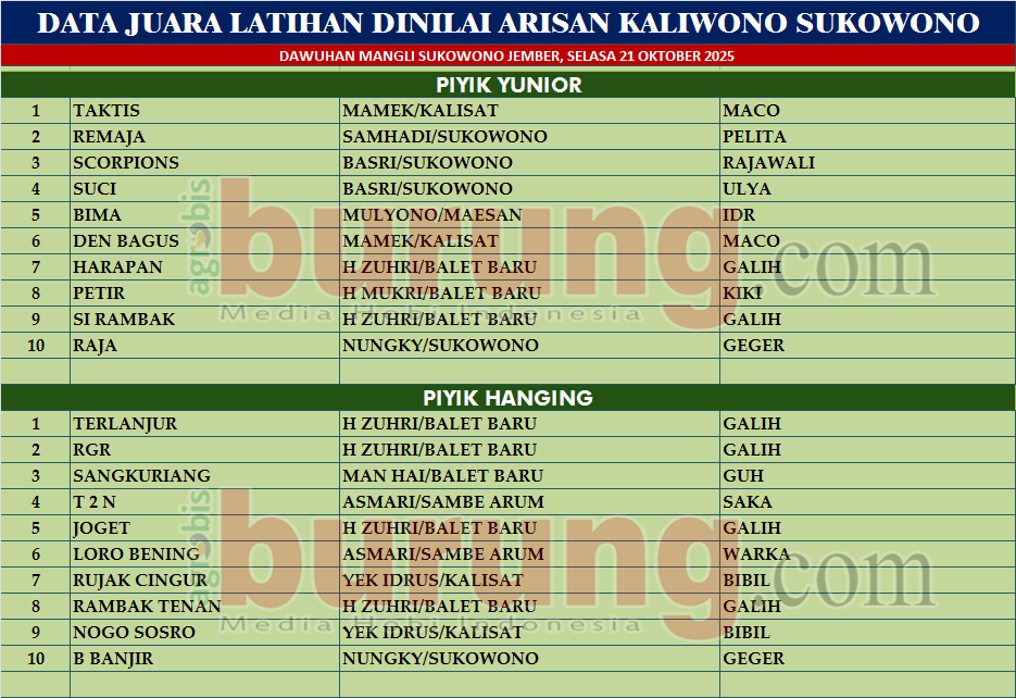 Aktifitas latihan dinilai arisan di Sukowono Jember dan sekitarnya juga rutin dilaksanakan, termasuk gelaran latihan dinilai Arisan Kaliwono, Dawuhan Mangli Sukowono Jember pada Selasa (21/10). Dan agenda ini juga menjadi ajang melatih burung burung jagoan untuk ditampilkan di gelaran yang lebih besar seperti di gelaran Sumber Baru Cup akhir pekan datang seklaigus untuk menghormati (alm). H badri.