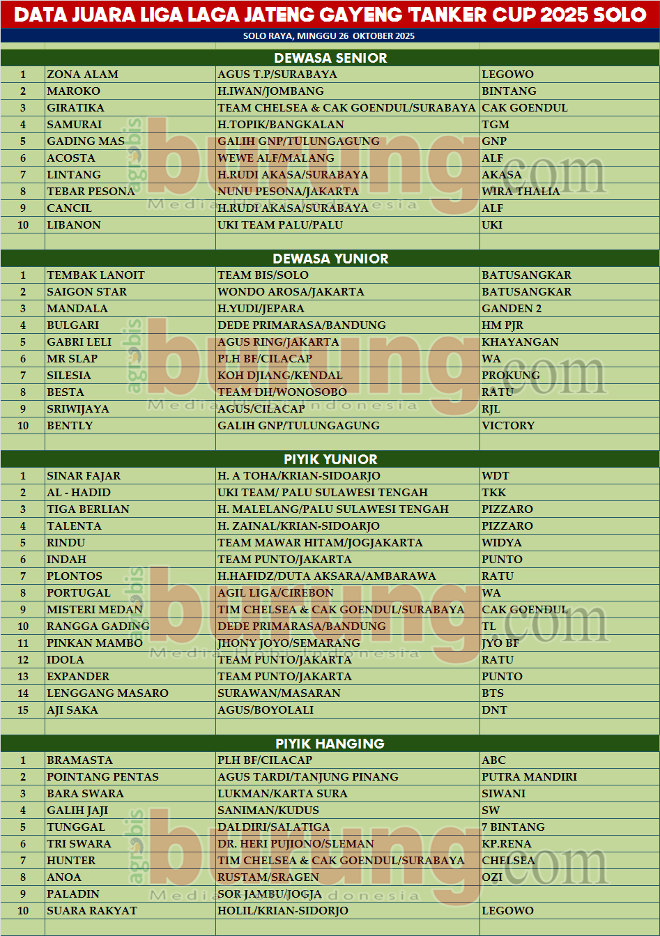 SOLO, agrobisburung.com – Gelaran Liga Laga Bintang Jateng Gayeng #7 bertajuk Tanker Cup 2025 di Lap. pengda Solo Raya, Gawanan Colomadu Karanganyar berlangsung seru dan tetap diserbu kungmania lintas blok. Cuaca dengan hembusan angin yang hadir sepanjang gelaran benar benar menguji mental tarung jago jago yang berlomba. Septian Holly mewakili panitia mengatakan bahwa gelaran kali ini sudah terjadwal di agenda pengwil Jateng sebagai seri Liga Jateng Gayeng 2025 dan pelaksanaannya bisa berjalan dengan baik dan juga dihadiri kungmania linta blok untuk menjadi yang terbaik. “Terima kasih kepada Kungmanja dari luar Solo Raya baik itu Jateng, Jatim, Jabar dan DKI yang sudah berkenan hadir. Serta terima kasih kepada kru panitia dan pengurus pengda Solo Raya yang sudah support hingga pelaksaan liga dengan meriah dan sukses, ‘” ucap Septian Holly.