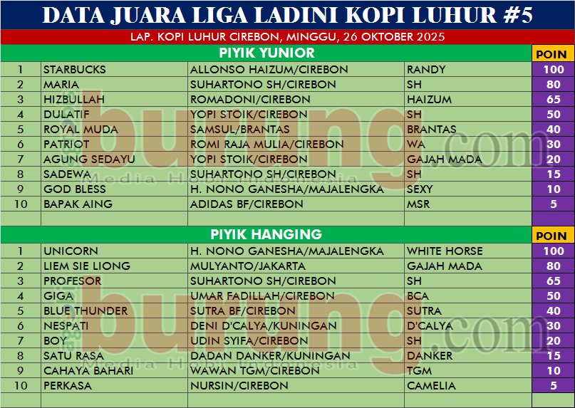 Di kelas piyik hanging, H. Nono Ganesha Majalengka berhasil mengantarkan andalannya Unicorn (WH) sebagai juara 1. Peringkat kedua ditempati Liem Sie Liong (Gajah Mada) andalan Mulyanto Jakarta. Sedangkan posisi ketiga ditempati Profesor (SH) andalan Suhartono SH Cirebon. Secara keseluruhan lomba yang dihelat P3SI Pengda Cirebon ini berlangsung menarik, aman dan lancar. Apalagi didukung oleh cuaca yang begitu cerah. Kungmania yang hadir nampak guyub dan rukun sesuai tema gelaran liga ini, yang lebih mengedepankan menggali potensi pemula dan burung-burung debutan.