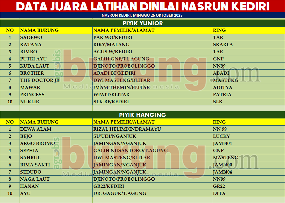 Sementara itu hasil pertarungan sengit di lap. Nasrun Kediri dimasing masing kelas menampilkan di kelas piyik yunior jawara Sadewo bergelang TAR milik Pak WO asal Kediri benar benar mampu mengoptimalkan petarungan terbaiknya dengan lawan lawannya untuk merebut podium pertama dengan kemenangan istimewa. Dan menyusul Jawara Katana bergelang Starla dan jawara Bimbo yang juga bergelang TAR menempati podium kedua dan ketiga