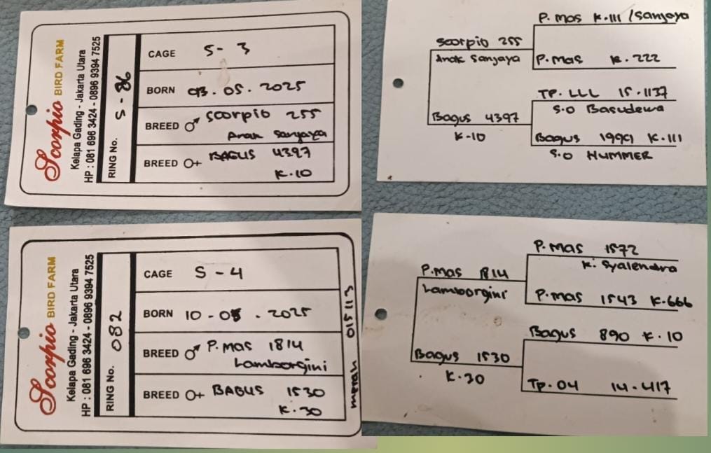 Billah menambahkan, kedua burung tersebut merupakan hasil produksi kolaborasi antara Billah Bagus Bekasi dengan Ali Scorpio Jakarta. Lahir juga di markas Bagus BF yang kini berganti nama menjadi Rafzia BF. Scorpioa S3 (Scorpio Anak Sanjaya x Bagus K.10) dan Scorpio S4 (Pandan Mas Lamborghini x Bagus K.30).