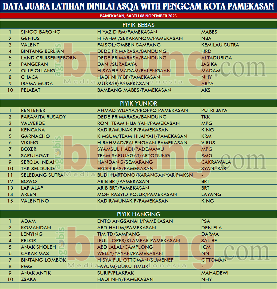 Dan dikelas piyik hanging yang menjadi pemenang pertama adalah jawara Adam bergelang PSA milik Ento Angsanah Pamekasan yang disusul posisi kedua jawara Komandan bergelang Den Ela. Diposisi ketiga ditempati jawara Lenying berglang Darma.