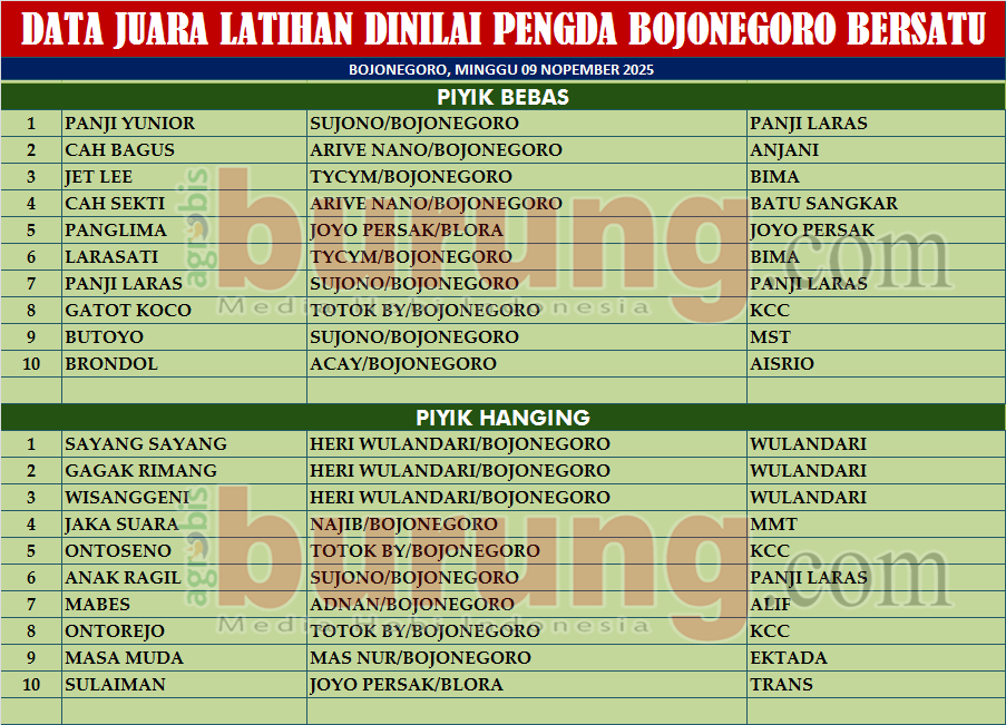 Sementara itu hasil dari latihan dinilai yang memainkan dua klas (piyik bebas & hanging) menampilkan jawara terbaik di masing masing kelas, di kelas piyik bebas, jawara Panji Yunior bergelang Panji laras milik Sujono asal Bojonegoro tampil dominasi di kelasnya. Panji Yunior yang sejak start sudah menguasai permainan di kelasnya dengan gesit meraih podium pertama dan disusul jawara Cah Bagus bergelang Anjani dan jawara Jet Lee bergelang Bima yang menempati podium kedua dan ketiga.
