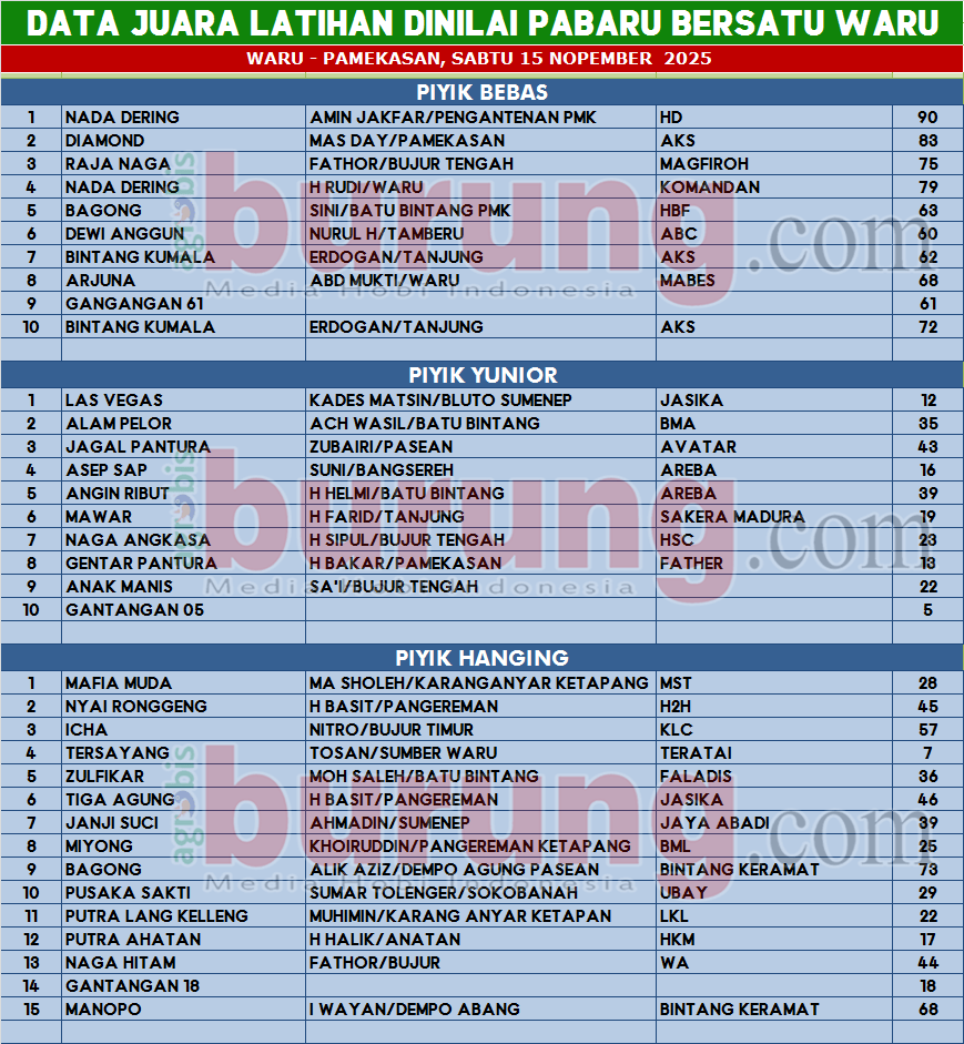 Gelaran latihan dinilai “Pabaru” (Pasean, Batumarmar & Waru) yang dilaksanakan pada Minggu (15/11) di lapangan Peternakan Waru Pamekasan berlangsung meriah dan lancar. Kehadiran kungmania Pabaru dan sekitarnya plus kungmania dari Kota Pamekasan tetap memberikan warna tersendiri hobi perkutut di Pamekasan Madura. Rudi Sonok, ketua panitia mengatakan bahwa kungmania di Pabaru yang berada di Pamekasan Utara memang luar biasa antusiasnya dengan hobi perkutut dan setiap gelaran di tiga pengcam Pasean, Batumarmar & Waru gelarannya selalu full dan meriah.