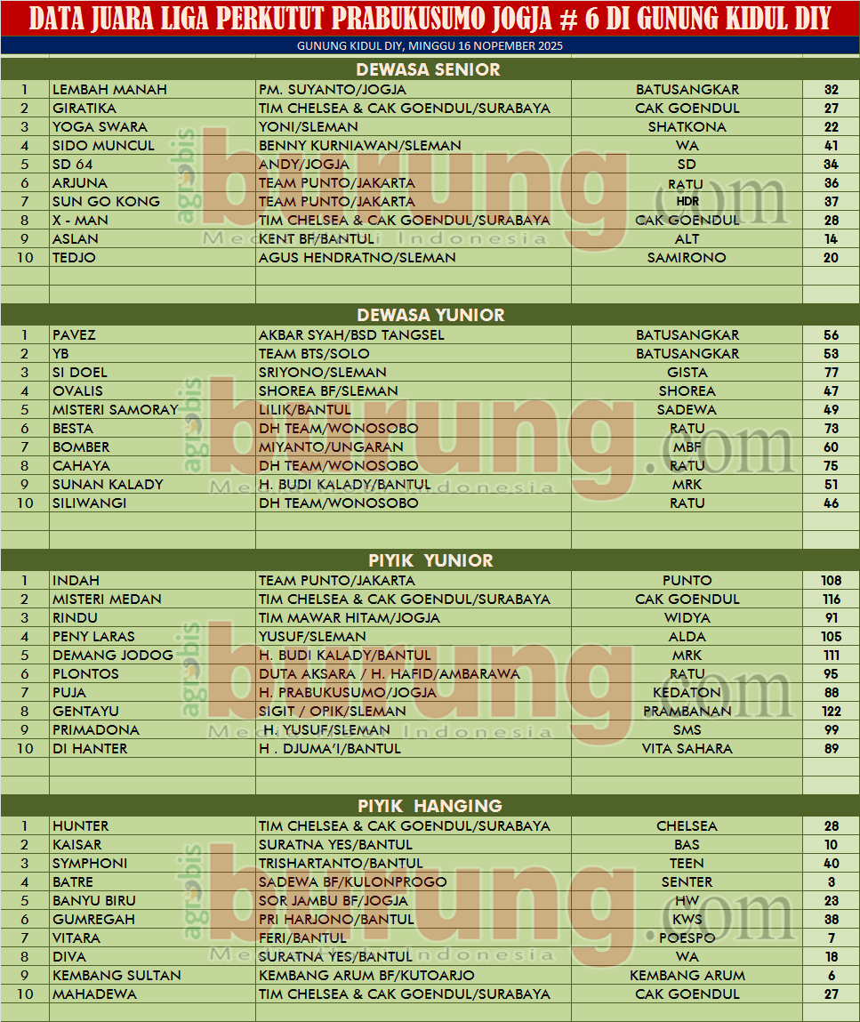 Sementara itu jalannya liga menampilkan pertarungan sengit dimasing masing kelasnya, walau sempat akan diguyur hujan sepanjang sepakan lalu yang selalu hujan deras namun di hari pelaksanaan LPPJ # 6 bisa berjalan lancar hingga tuntas di babak ke-4. di dewasa senior, jawara Lembah Manah (Kerekan 32) bergelang Batu Sangkar milik PM Suyanto Jogja memperlihatkan ketangguhan dengan tetap menguasai penampilan terbaiknya untuk merebut podium pertama. Di susul jawara Giratika (Kerekan 27) bergelang Cak Goendul dan jawara Yoga Swara (Kerekan 22) bergelang Shatkona yang menempati podium kedua dan ketiga.