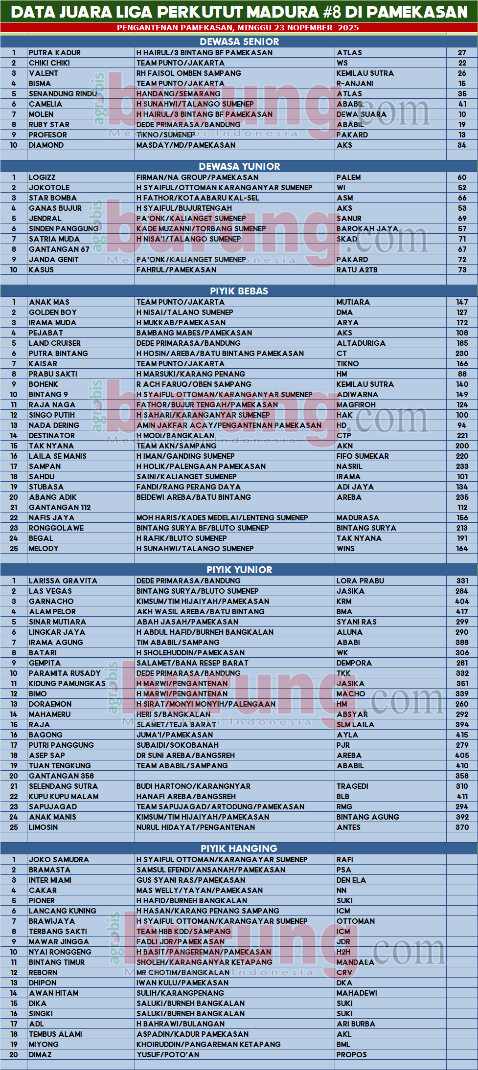Nah itulah mengapa juri “jebolan LPM” itu bisa memiliki dedikasi yang bagus karena mereka sudah ditempa untuk memiliki komitmen yang kuat terhadap tujuan dan tugasnya yang dikerjakannya dengan disipiplin, kerja keras dan sikap positif untuk menghasilkan hasil yang berkualitas. Karena jurinya bisa berdedikasi maka juara yang dihasilkan di LPM #8 Pamekasan bisa mendapatkan apresiasi yang tebaik dari para juaranya dan inilah hasil kejuaraannya :