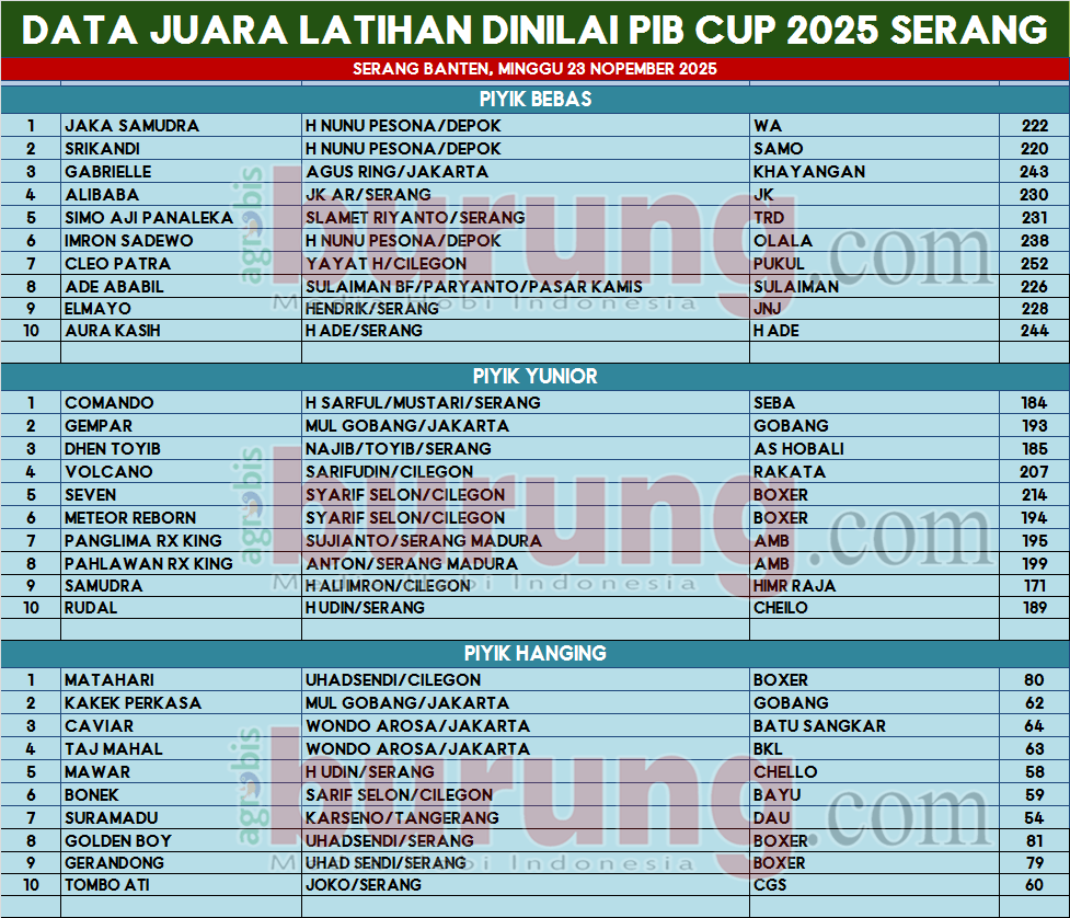 Gelaran latihan dinilai bertajuk PIB Cup 2025 yang dilaksanakan pada Minggu (23/11) di bird arena Citra Gading Serang Banten diseru kungmania Serang Banten dan seputaran Sejabodetabek. H Saeful Bahri, ketua panitia mengatakan bahwa dari semua blok yang disediakan panitia, 90 persen targetnya terpenuhi dimana pesertanya hadir dari Serang, Cilegon, Padeglang, Tangerang dan juga Jakarta. Agenda ini juga menjadi bukti kalau kungmania di Serang Banten akan menyemarakkan kembali hobi perkutut supaya semakin maju dan berkembang serta bisa muncul burung burung lapangan yang berkualitas.