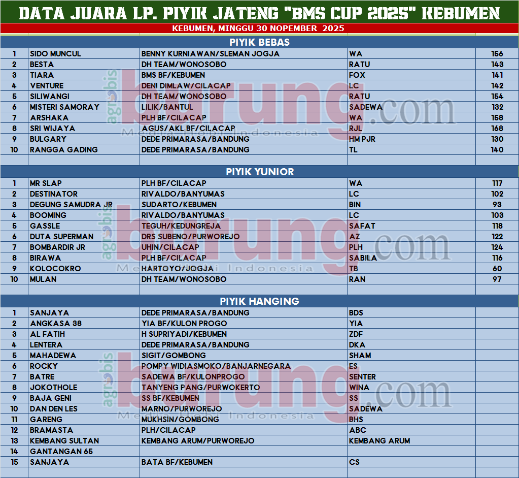 Laga penutupan poin Liga Perkutut (LP) # 11 Piyik Jateng 2025 dituntaskan di gelaran bertajuk BMS Cup 2025 Kebumen pada Minggu (30/11) yang dilaksanakan Pengda Kebumen di Lap. Pengda Kebumen, Puskud Kebumen berjalan dengan tertib dan meriah. Sudarto, ketua pengda Kebumen mengatakan bahwa agenda kali ini adalah seri LP. Piyik Jateng 2025 putaran penutup dan smua jawara muda yang masuk di klasemen juga ikut terjun sehingga target pesertanya tercapai.
