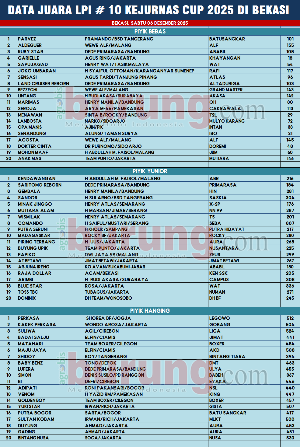 Full Doorprize Wah & Data Juara Lengkap LPI #10 Kejurnas Cup 2025 di Bekasi (Kelas Piyik)