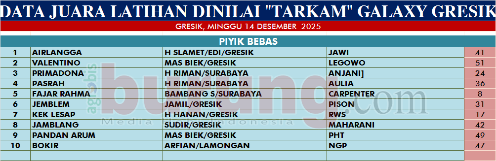GRESIK, agrobisburung.com – Gelaran latihan dinilai “Tarkam” Galaxy Gresik pada Minggu (14/12) di Lap. Galaxy kembali digulirkan di penghujung tahun 2025. Abah Hannan, koordinator latihan “Tarkam” Galaxy Gresik mengatakan bahwa kegiatan ini memang selalu di laksanakan untuk mengisi kegiatan kosong dan alhamdulillah kungmania di Gresik dan sekitarnya juga ikutan hadir meramaikan agenda baru kungmania Gresik. “Selamat kepada para pemenang latihan Tarkam kali ini, kebersaamaan kita lebih penting karena bisa selalu satu jalur yang sama,” ucap H Hannan