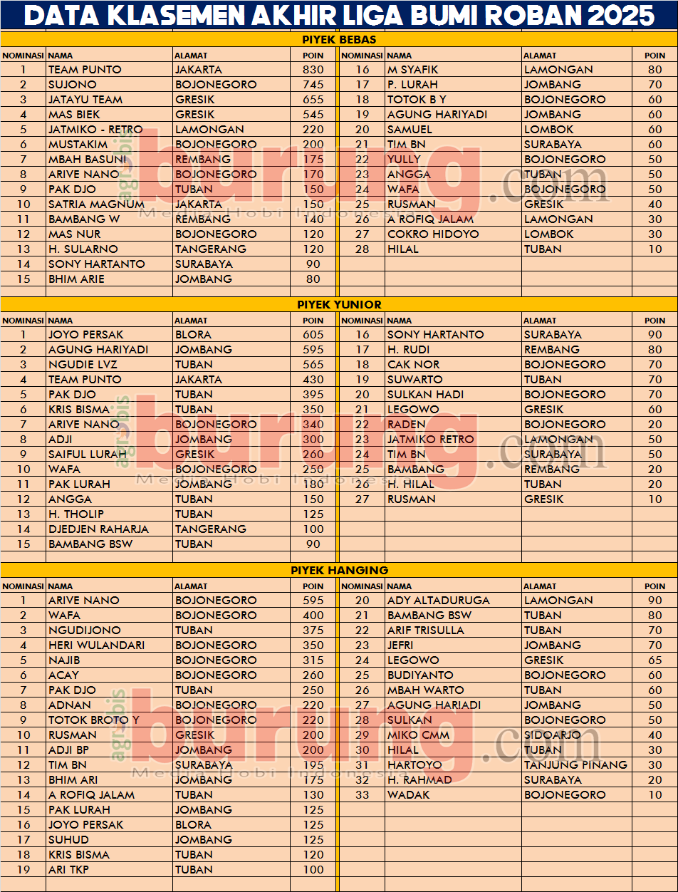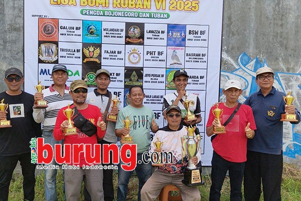 TUBAN, agrobisburung.com – Setelah gelaran closing poin Liga Bumi Roban #10 tuntas sampai penyerahan kejuaraan, panitia Liga Bumi Roban langsung merekap serta langsung menyerahkan nominasi burung terbaik. Nominasi ini diberikan kepada jawara atau pemilik juara dari semua seri 1 sampai 10 yang diikutinya. Murada, salah satu panitia Liga Bumi Roban mengatakan bahwa dari 10 seri yang sudah diselesaikan akhirnya para nominasi terbaik di Klasemen akhir Liga Bumi Roban 2025 berhak atas trhopy kejuaraan.