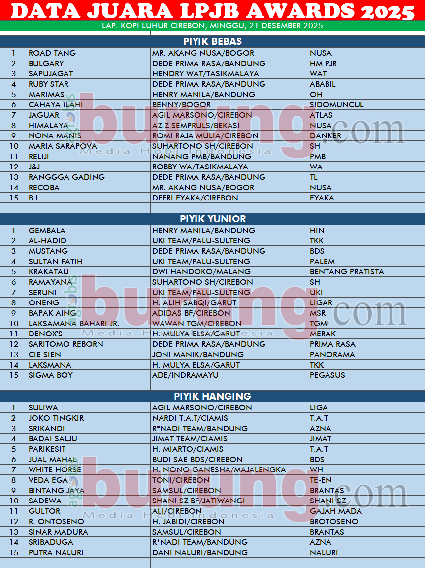 Kemeriahan acara dilengkapi dengan penyerahan 10 besar nominasi klasemen LPJB 2025, dan jawaranya diraih Marimas (Henry Manila Bandung) kelas piyik bebas, Dede Prima Rasa Bandung dikelas piyik yunior dan Iwan Pale RTF Bandung dikelas piyik hanging. Sementara itu, 4 motor doorprize utama direbut Palem Team Tasikmalaya (2), Dede Prima Rasa Team Bandung dan H. Wawan DVK Majalengka. “Terimakasih kepada semuanya. Panitia LPJB 2025 yang sudah bekerja maksimal selama setahun. Kemudian para sponsor pendukung, serat Kungmania dari berbagai daerah yang sudah berpartisipasi. Sampai bertemu lagi tahun depan,” ungkap H. Nono Ganesha, ketua LPJB 2025, yang didampingi Ancu Sunardi Platinum, ketua P3SI Pengda Cirebon.