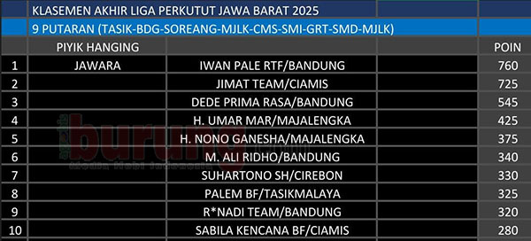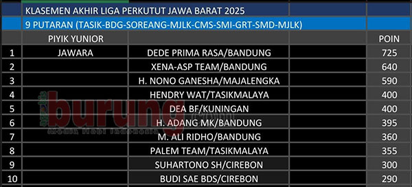 CIREBON, agrobisburung.com – Sejak putaran awal LPJB 2025, posisi Marimas (OH) andalan Henry Manila Bandung tak tergoyahkan di puncak klasemen sementara piyik bebas. Kondisi ini berlangsung hingga putaran akhir. Hal ini karena tidak pernah absen dan selalu masuk nominasi diswtiap putaran. Sehingga perolehan poinnya meninggalkan jauh para pesaingnya, seperti Red Devils (Red Bulls) andalan Xena-ASP Team Bandung dan Napoleon (Jesika) andalan Prosper 1234 Team Bandun. Kefuanga bahkan menempel diposisi ketldua dan ketiga di klasemen akhir.