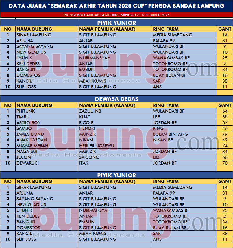 Gelaran regional “Semarak Akhir Tahun 2025 Cup” yang digelar di Lapangan Pringsewu, Lampung, Minggu (21/12/25), disambut antusias Kungmania Lampung dan sekitarnya. Dua blok gantangan yang disediakan peserta full. Bahkan, banyak yang tidak kebagian tiket. Lomba perdana pasca kebangkitan perkutut Lampung ini disupport para tokoh perkutut Lampung, diantaranya Ahok (Jordan BF/Ketua P3SI Pengwil Lampung), Cutek (Nikan BF) dan Heru (Embun BF). Lomba kali ini juga dipimpin oleh para juri senior Lampung, yakni Amat, Eko dan Nanang.
