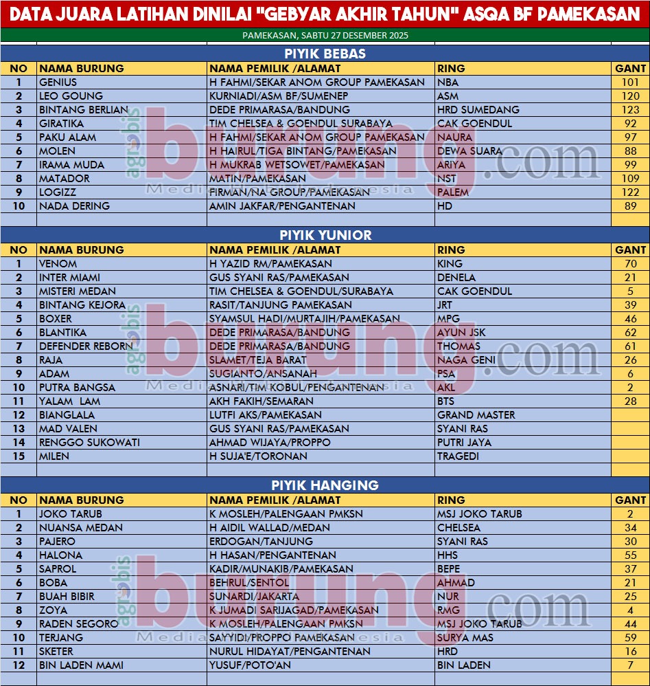 PAMEKASAN, agrobisburung.com – Gelaran gebyar akhir tahun latihan dinilai Asqa BF pada Sabtu (27/12) di Lap. Asqa Bf Pamekasan benar benar menjadi agenda penutup tahun yang meriah. Peserta yang hadir juga dari beberapa kungmania dari Pamekasan termasuk beberapa kungmania dari Surabaya yang ikutan merapat. Arif BRT, ketua panitia mengatakan bahwa agenda tutup tahun latihan dinilai Asqa BF memang sudah teragendakan sebagai penutup kegiatan kungmania di Pamekasan di akhir tahun 2025. Dan alhamdulillah latihan dinilai akhir tahun kali ini luar baisa pesertanya, bahkan ada beberapa kungmania yang tidak kebagian tiket karena benar benar sudah full pesertanya. ” Terima kasih kepada kungmania yang sudah hadir meramaikan agenda tutup tahun di lap. Asqa Pamekasan, terima kasih juga kepada Abah Azis dan Bambang Mabes sebagai ketua dan wakil ketua pengda Pamekasan yang selalu support kegiatan latihan dinilai di pengcam pengcam se-Pamekasan,” ucap Arif BRT