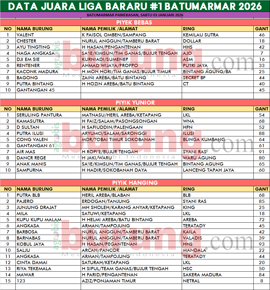 “Kita ke selanjutnya untuk gelaran Liga Pabaru Bersatu 2026 juga akan digulirkan pada Feberuari mendatang dengan memainkan di kelas piyik hanging untuk mengoptimalkan hasil breeding peternak di Pabaru-Pantura. Kita ke depannya juga akan terus berupaya untuk menjadikan Pabaru-Pantura lebih maju, terus berbenah sehingga bisa membawa dampak yang baik buat perkembangan hobi perkutut di Pabaru dan juga Pamekasan Madura,” ucap Hamidi, Ketua Pabaru yang dibenarkan H Hosen, ketua pengcam Batumarmar
