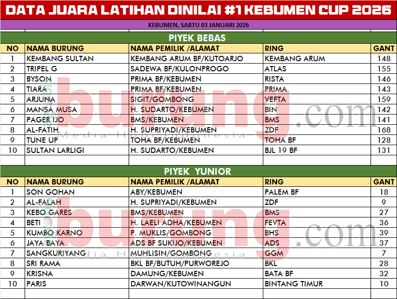 Pesertanya Full di Agenda Perdana 2026, Jawara Kembang Sultan & Song Gohan Jadi Terbaik di Latihan Dinilai #1 Kebumen Cup
