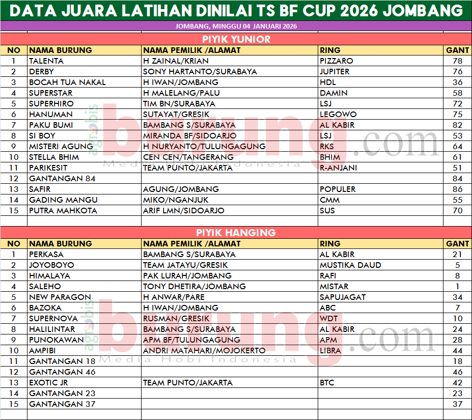 Setelah sepekan lalu menggelar latihan dinilai, Markas TS BF Denanyar Jombang pada Minggu (04/01) kembali diserbu kungmania untuk mengikuti gelaran TS CUP 2026. Namun untuk gelaran yang 04 Januari kelasnya utamanya piyik yunior dan hanging sementara yang sepekan lalu kelas utamanya piyik bebas. H Iwan, pemilik TS BF Jombang mengatakan sangat berterima kasih atas kehadiran kungmania di markas TS BF, padahal sepekan lalu juga sudah digelar agenda yang sama namun gelaran berikutnya tetap full pesertanya. “Alhamdulillah dua pekan gelaran yang sama anstusias kungmania untuk hadir tetap tinggi, selanjutnya Lap. TS akan mengangendakan latihan dinilai secara rutin untuk lebih menyemarakkan hobi perkutut di Jombang dan sekitarnya,” ucap H Iwan pada agrobisburung.com