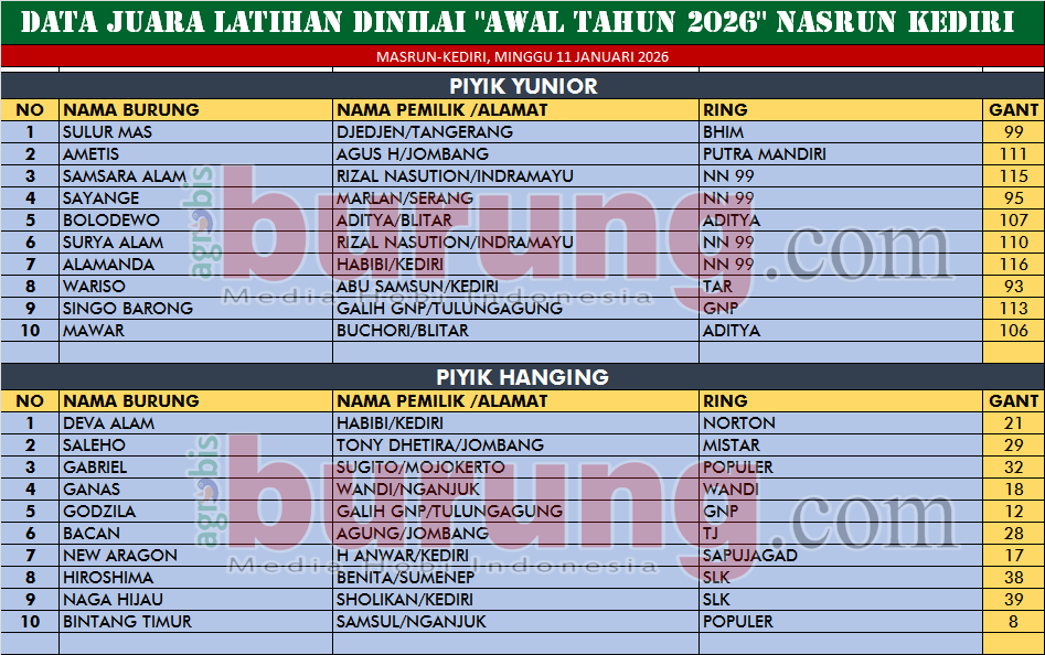 Sementara itu hasil pertarungan dari dua kelas yang dimainkan dikuasai burung burung yang memang tampil terbaik, di kelas piyik yunior, debutan muda bernama Sulur Mas (gantangan 99) bergelang Bhim milik Djedjen asal Tangerang yang dikawal Udin Bhim sukses meraih podium pertama di kelasnya. Keberhasilan Sulur Mas melejit di posisi tersebut setelah selama lomba mampu menahan gempuran sengit dari jawara Ametis (Gantangan 111) bergelang Putra Mandiri dan jawra Samsara Alam (Gantangan 115) bergealng NN 99 yang harus puas menempati podium kedua dan ketiga.