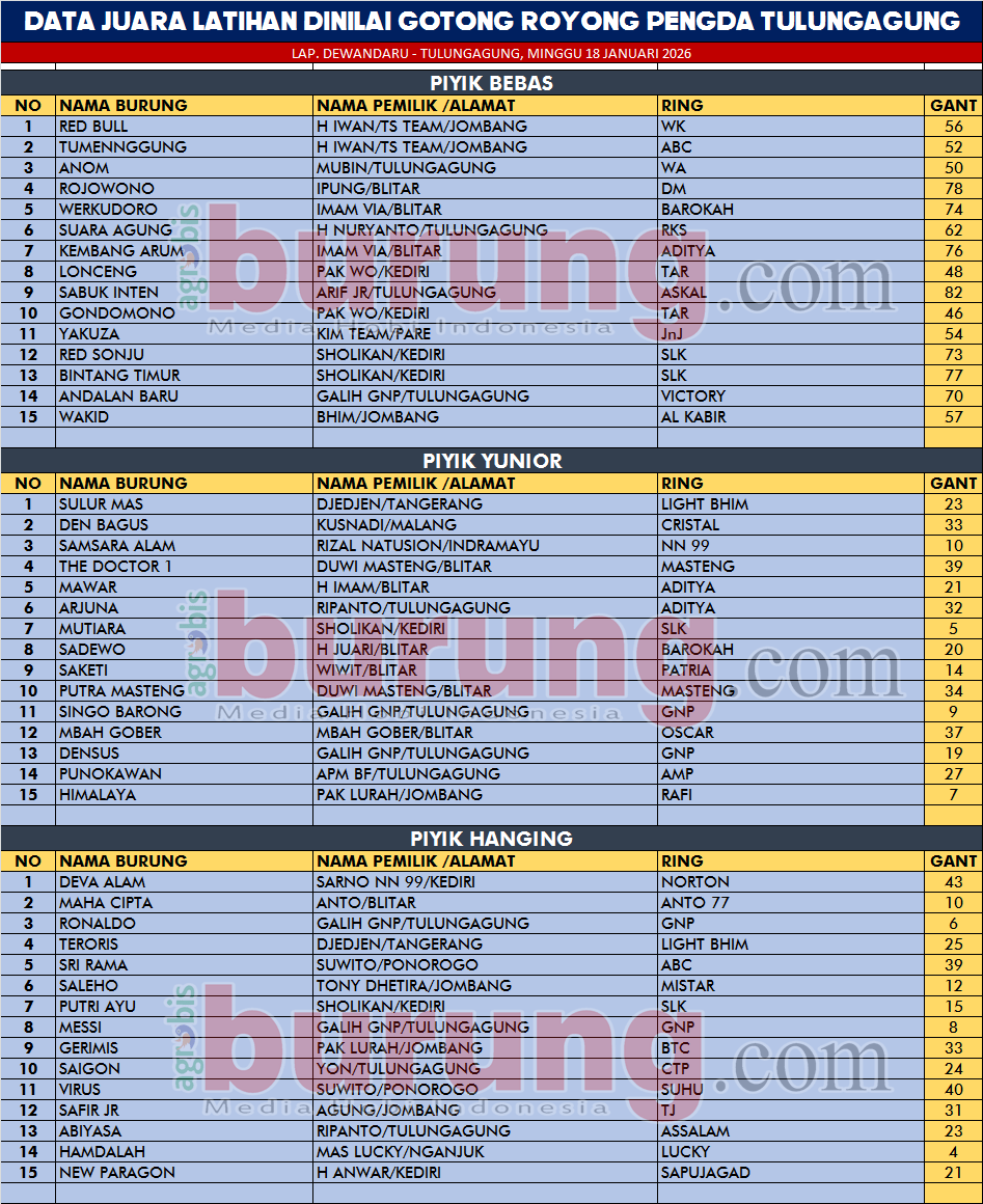 TULUNGAGUNG, agrobisburung.com – Agenda perdana Pengda Tulungagung di tahun 2026 diawali dengan gelaran latihan dinilai Gotong Royong “Dewandaru” yang dilaksanakan pada Minggu (18/01) di Lap. Perkutut Dewandaru. Gelaran ini juga diserbu kungmania Gotong Royong dari Mojokerto, Jombang, Nganjuk, Blitar, Kediri, Ponorogo dan tentunya Kungmania Tulungagung. H Nuryanto, ketua pelaksana mengatakan bahwa agenda awal tahun 2026 di laksanakan dengan pelaksanaan Latihan Dinilai Pengda Tulungagung yang dilaksanakan di Lap. Dewandaru yang memainkan kelas piyik (Bebas, Yunior & Hanging) serta di hadir jawara jawara keren yang punya potensi menjadi jawara hebat. Termasuk salah satunya adalah Red Bull andalan H Iwan TS Jombang yang tampil sempurna dengan raihan 4 warna di babak ketiga dan prestas ini juga menjadi nilai “pecah telor” awal tahun 2026 sebagai bukti di agenda Gotong Royong masih eksis mencetak burung burung kelas nasional. “Terima kasih kepada semua kungmania yang sudah meluangkan waktunya hadir di Tulugagung dan selamat kepada para juara atas prestasi hebatnya,” ucap H Nuryanto pada agrobisburung.com