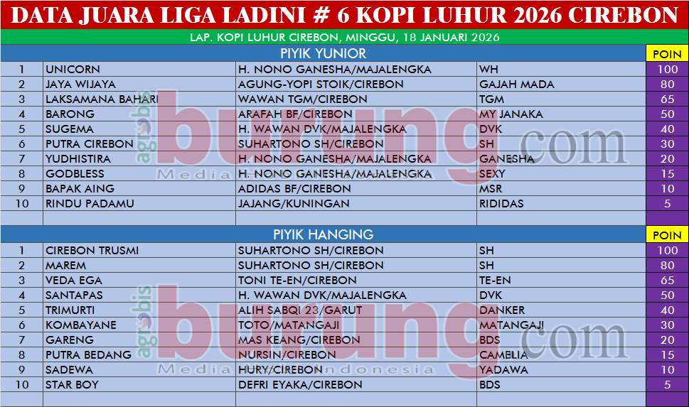 Di kelas piyik hanging, dua andalan anyar Suhartono SH Cirebon, yakni Cirebon Trusmi dan Marem berhasil menguasai 2 Besar. Generasi terkini trah jawara Legendaris. Posisi ketiga ditempati Veda Ega (Te-En) debutan Toni Te-En Cirebon. Kelas pemula ini termasuk sengit persiangannya. Nominasi 10 Besar meraih tiga warna. Termasuk Star Boy (BDS) rekrutan anyar Defri Eyaka yang baru di-take over dari Budi Sae BDS Cirebon dengan harga meriah.
