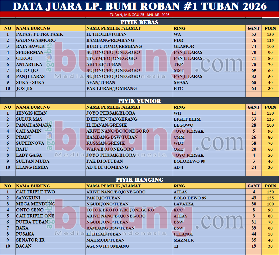 Di kelas piyik yunior, debutan muda Jengiskhan (Kerekan 11) bergelang WH milik Joyo Persak asal Blora bikin kejutan di kelasnya, tampil penuh percaya diri Jengiskha mampu mengatasi tekanan dari lawannya untuk merebu posisi terbaik pertama. Disusul jawara Sulur Mas (Kerekan 33) bergelang Light Bhim terbaik kedua dan jawara Panah Asmara (Kerekan 28) bergelang Legowo diposisi terbaik ketiga.