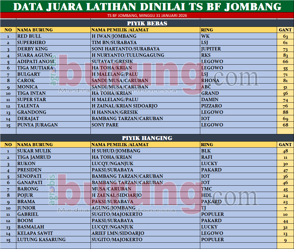 Sementara itu hasil kejuaraan dari pertarungan seru di dua kelas yang dimainkan jago tuan rumah memang terlalu tangguh untuk di hentikan lajunya, jawara Red Bull bergelang WK milik H Iwan Jombang yang diturunkan di kelas piyik bebas kembali mencetak kemenangan mutlak di kelasnya untuk merebut podium pertama. Bahkan raihan nilai 4 warna di babak ketiga benar benar membuat Red Bull selalu menang mudah terhadap lawan lawannya dan jawara Superhiro bergelang LSJ serta Derby King bergelang Jupiter harus puas menempati podiu kedua dan ketiga setelah perlawan sengitnya tak bisa menahan lajunya.