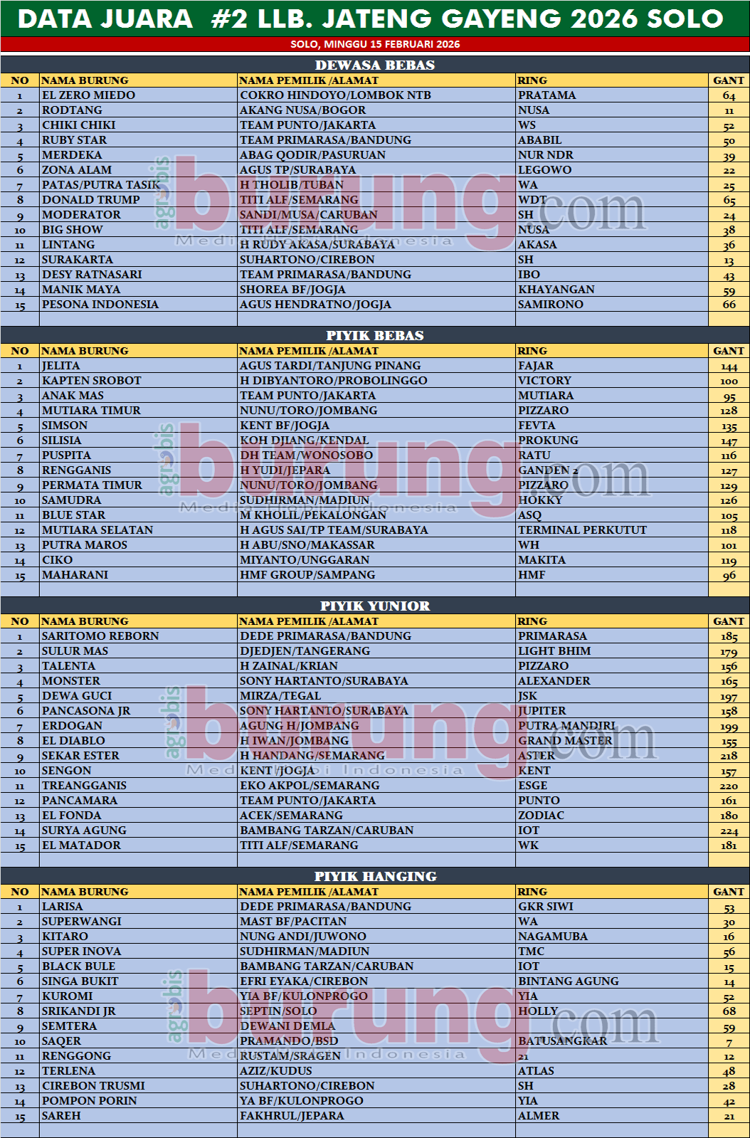 SOLO, agrobisburung.com – Lanjutan seri #2 Liga Laga Bintang Perkutut (LLBP) Jateng Gayeng 2026 “Mierah Royal Cup” pada Minggu (15/02) benar benar menjadi ajang tarung laga bintang jawara antar blok. Sederatan burung burung terbaik sata ini hadir di gelaran konkurs besar Pengwil Jateng jelang bulan Ramadhan 2026. Septian Holly, Ketua panitia mengatakan bahwa di gelaran (akhir) jelang bulan Ramadhan ini memang luar biasa animo yang mendaftar, bahkan pesertanya yang hadir benar benar dari berbagai blok Tengah/DIY, Barat/DKI dan juga dari Timur. “Kami sangat berterima kasih atas kehadiran kungmania sekalian yg dari berbagai kota di Jateng/DIY, Jabar/DKI dan juga Jatim untuk meramaikan gelaran di LLBP. Jateng Gayeng 2026. Terima kasih kepada pihak pihak yang sudah mendukung terlaksanakan agenda LLBP. Jateng #2 Gayeng 2026 di Solo dan selamat kepada para jawara yang meraih podium,” ucap Septian Holly.